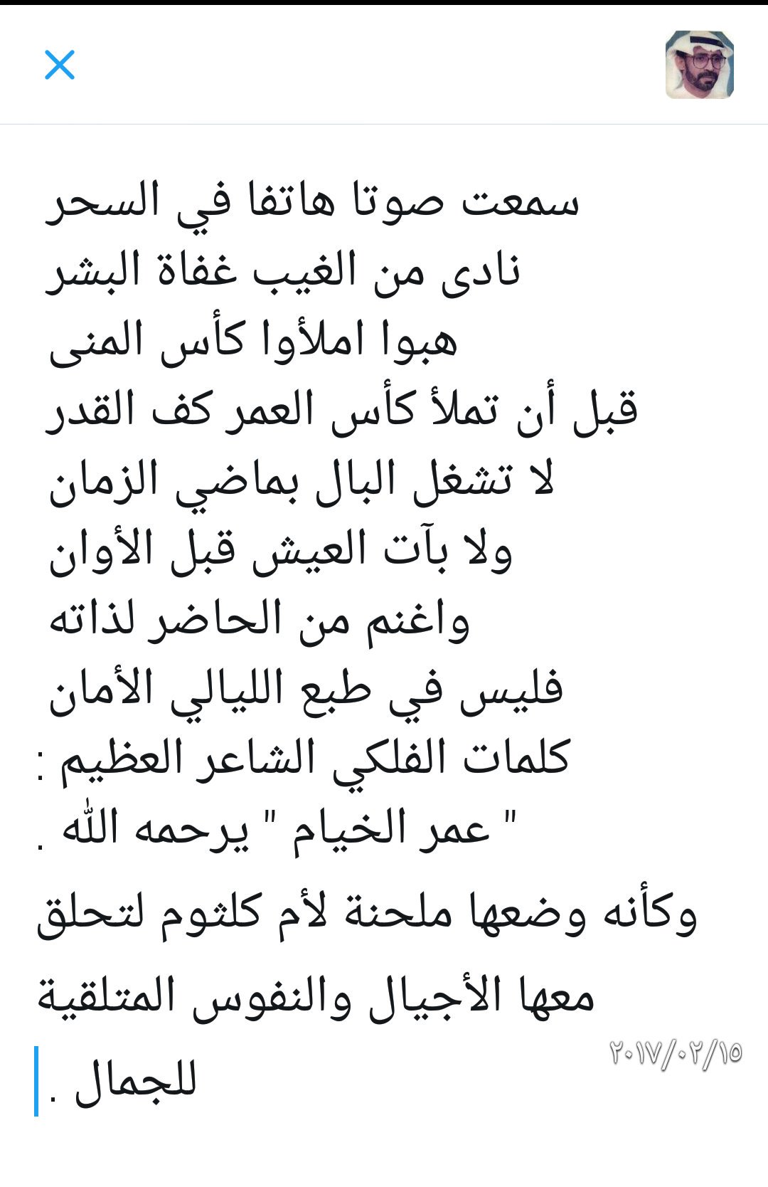 أم كلثوم المغرب 1968 السنباطي أحمد رامي رباعيات الخيام. الخيانة في بعض الأحيان تكون الشعور الأجمل، إذا كان الشخص المغدور يستحقها. سمعتُ صوتاً هاتفاً في السحر نادى من الغيب غفاة البشر هبوا املأوا كأس. الشاعر الخيام ليس مثله شاعر غير الصحابة رضوان الله عليهم اجمعين حقا انه حب الدين والوطن والتاريخ والا خلا ص في هذه الحياة وشكرا على. استماع وتحميل اغنية ام كلثوم رباعيات الخيام mp3 من البوم , دندنها.